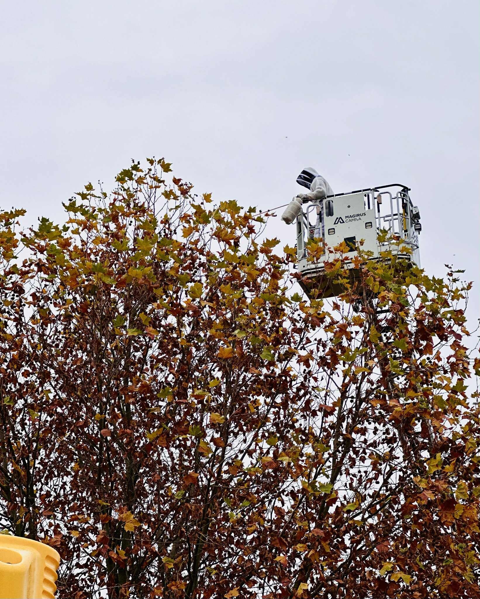 Een onverwacht spektakel vandaag op de speelplaats van XCL Wegwijs. Hoog in een boom, pal in het midden van de speelplaats, had een nest hoornaars zich genesteld. Reden genoeg voor de brandweer om met het nodige materiaal uit te rukken.