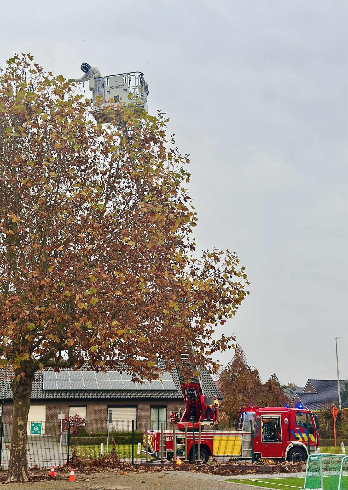 De kinderen stonden meteen op de eerste rij om alles goed te kunnen volgen. Ze zagen hoe de brandweerlui in speciaal beschermingspak de boom in gingen en hoe de indrukwekkende ladderwagen in actie kwam. Grote ogen, veel 'oooohs' en 'waaaaws'.