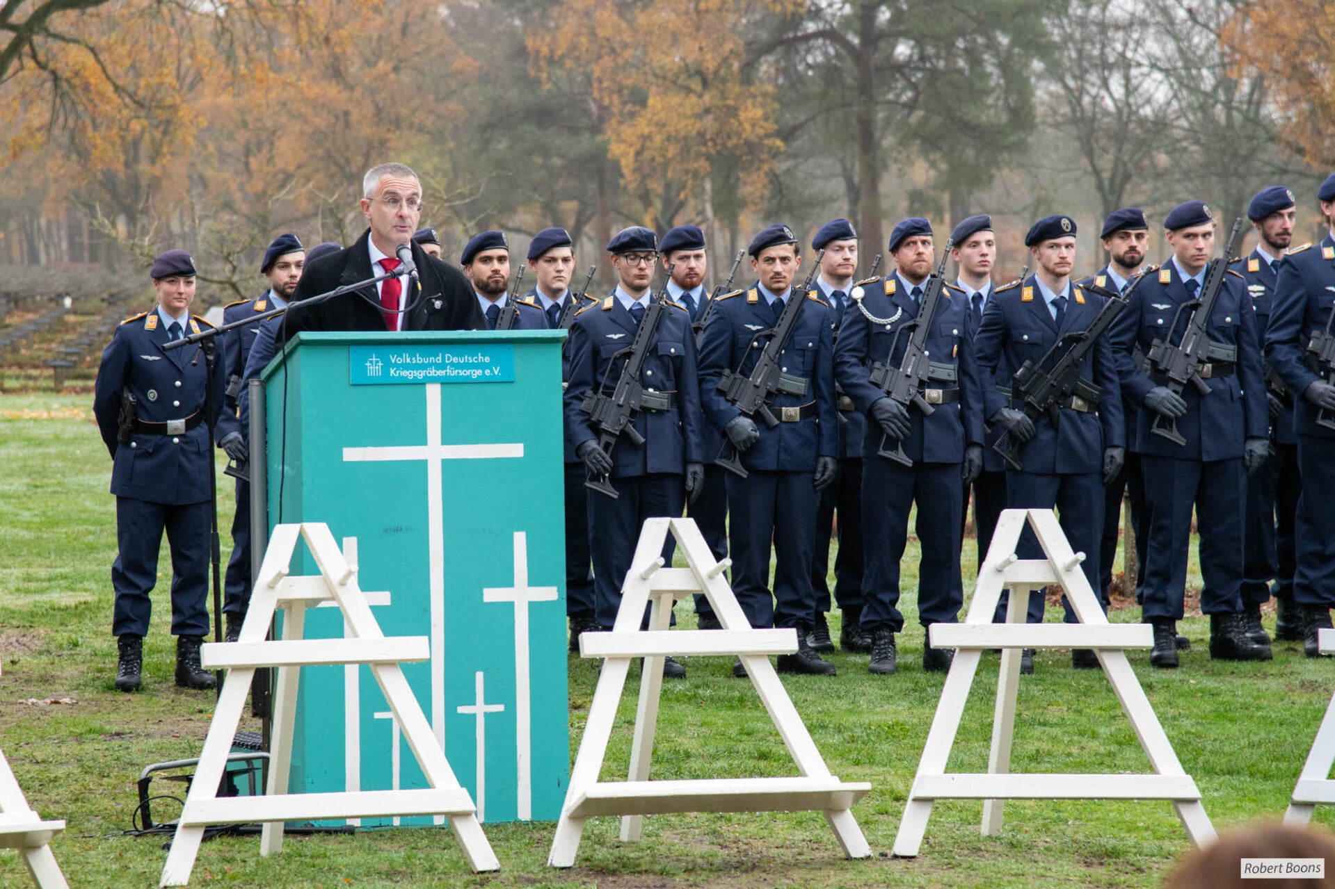 Vandaag vond op de Duitse Militaire Begraafplaats in Lommel de jaarlijkse herdenking van Volkstrauertag plaats, de Duitse nationale rouwdag. Tijdens deze ingetogen plechtigheid kwamen vertegenwoordigers van verschillende landen, organisaties en geloofsgemeenschappen samen om alle slachtoffers van oorlog, geweld en tirannie te herdenken. De herdenking stond opnieuw in het teken van het motto van de Volksbund: