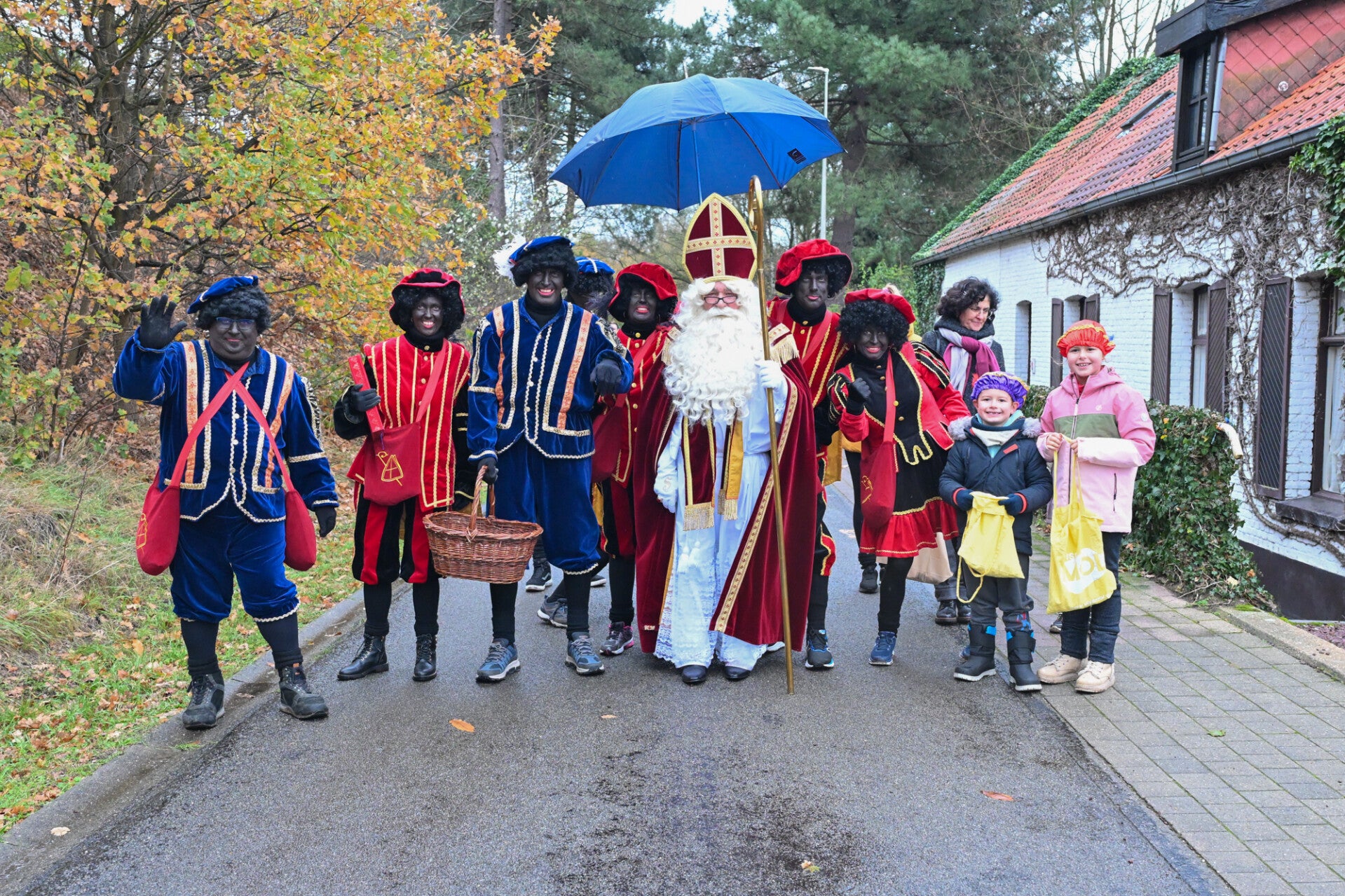 Daarna trok het gezelschap richting café Het Bergske. In de grote tent stond een speciale stoel klaar, en opnieuw zaten tal van kinderen vol spanning te wachten. Eén voor één mochten ze bij Sinterklaas komen. De Pieten deelden gul snoepzakjes uit, en ook ouders en grootouders werden niet vergeten. Het werd een gezellige halte vol lachende kinderen en rammelende snoepzakken.