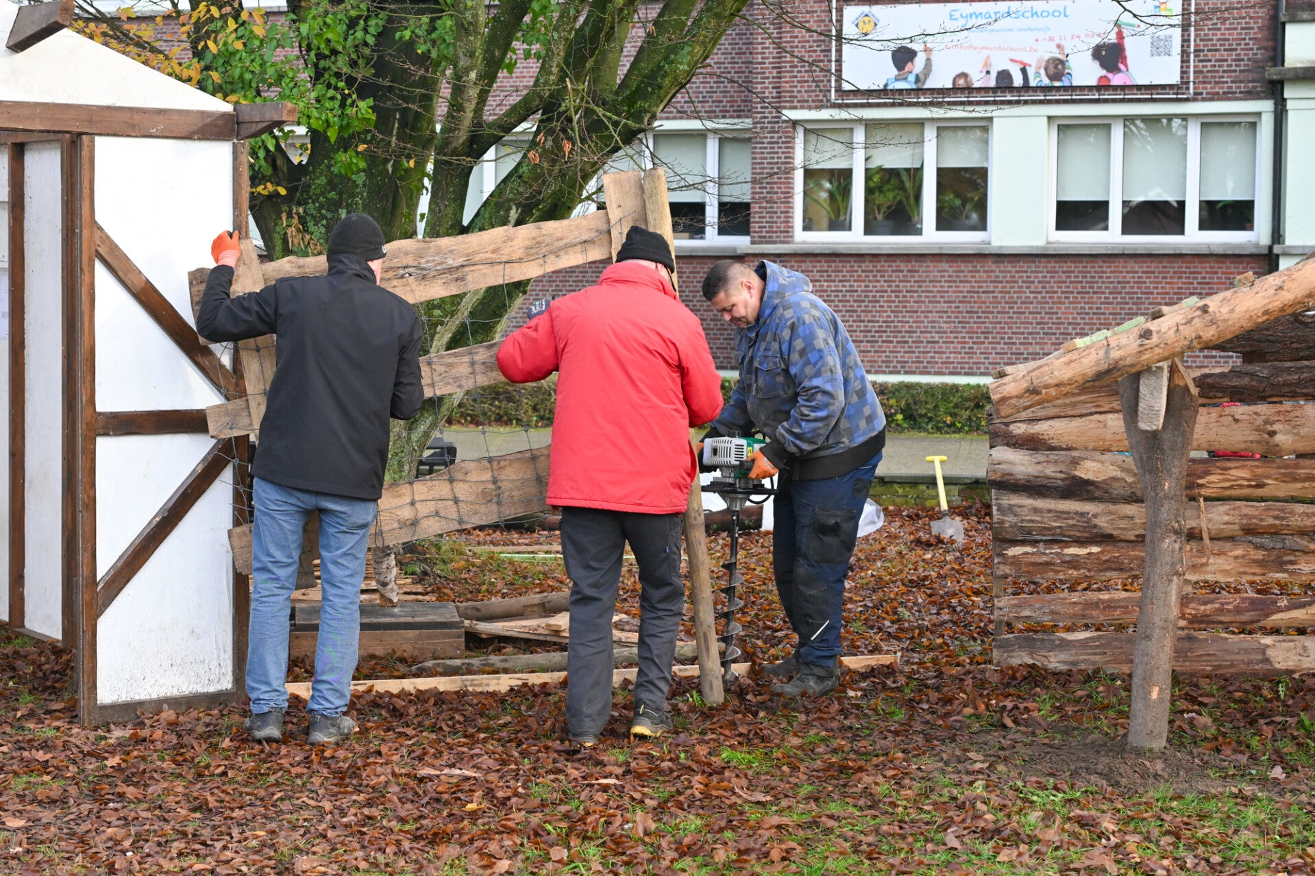 Ook aan de praktische kant wordt gedacht. Rond de stal brengen de vrijwilligers wolvendraad aan. Zodra binnen twee weken de dieren arriveren en de poort dichtgaat, wordt de draad onder stroom gezet om te voorkomen dat bezoekers zomaar bij de dieren kunnen. Veiligheid blijft daarbij een belangrijk aandachtspunt.