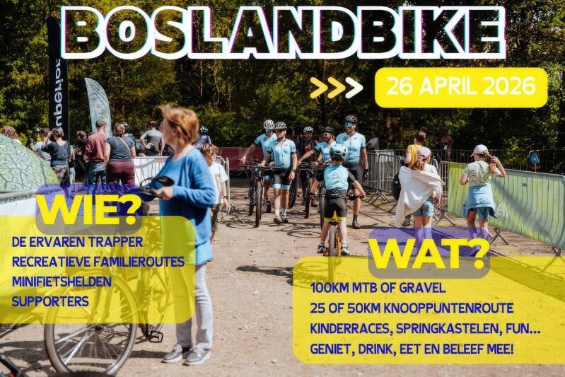 Inschrijven kan via www.boslandbike.be. Voor alle afstanden is vooraf inschrijven verplicht.
