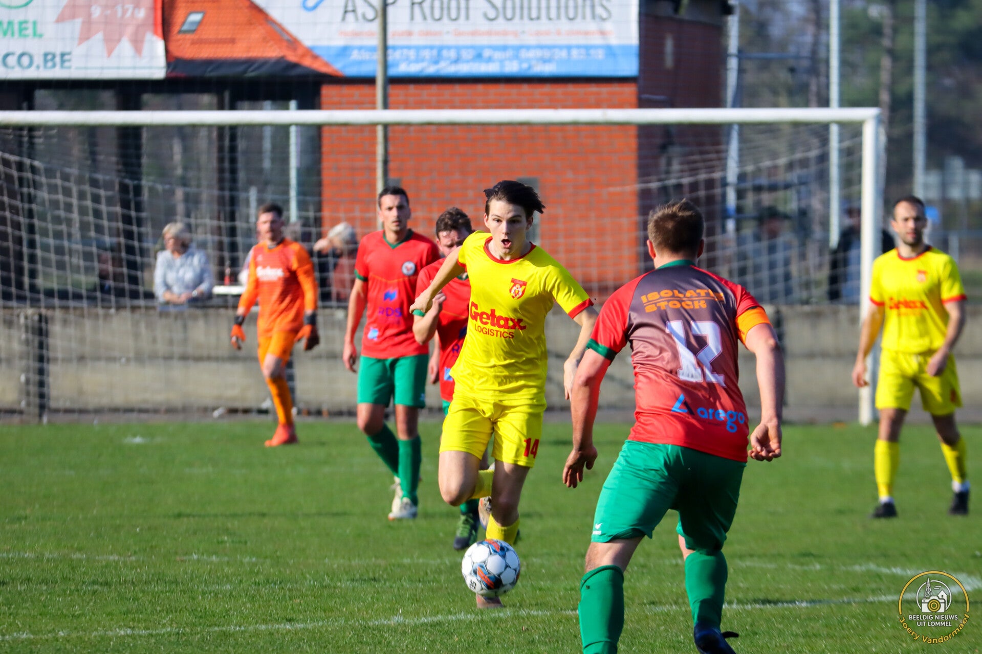 Deze namiddag kreeg Verbroedering Lommel (in het geel) het bezoek van Sporting Grote Heide, de zesde van het klassement. Beide ploegen zorgden voor een geanimeerde wedstrijd waarbij aan de rust de drie punten bijna een zekerheid bleken voor de thuisploeg. Want na amper 7 minuten spelen, kopte Arne Vromans zijn ploeg al op een 1-0 voorsprong. Op het kwartier schilderde Hakan Bayraktar eerst nog wel een vrije trap perfect op het hoofd van Elias Loots die ongehinderd de 1-1 mocht binnenkoppen, maar verder domineerde Verbroedering Lommel de eerste helft. Het liep dan ook weer verdiend uit na doelpunten van Eren Altintas (2x) en Kynan Ceulemans, waardoor ze met een bijna zege zekere 4-1 voorsprong de kleedkamers opzochten. (Foto's Joery Vandormael)