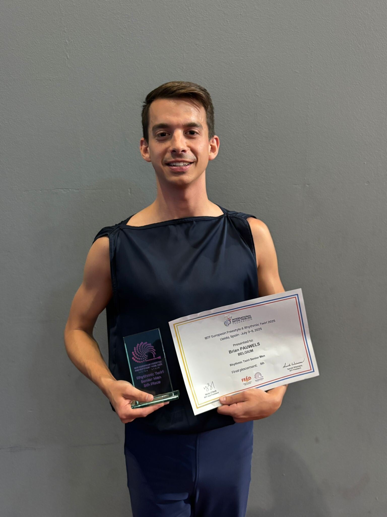In 2025 mocht Brian België opnieuw vertegenwoordigen op het Europees Kampioenschap in Lleida (Spanje). Hij moest als allerlaatste zijn oefening doen en zette een van zijn beste prestaties ooit neer. Stress gooide echter roet in het eten waardoor hij van de derde naar de vijfde plaats zakte (foto 1 onder). Maar hij bewees in Spanje dat ook een klein land als België talent heeft en meetelt, en liet zien dat Belgische twirlers niet zomaar “opvulling” zijn in een internationale finale. Integendeel.