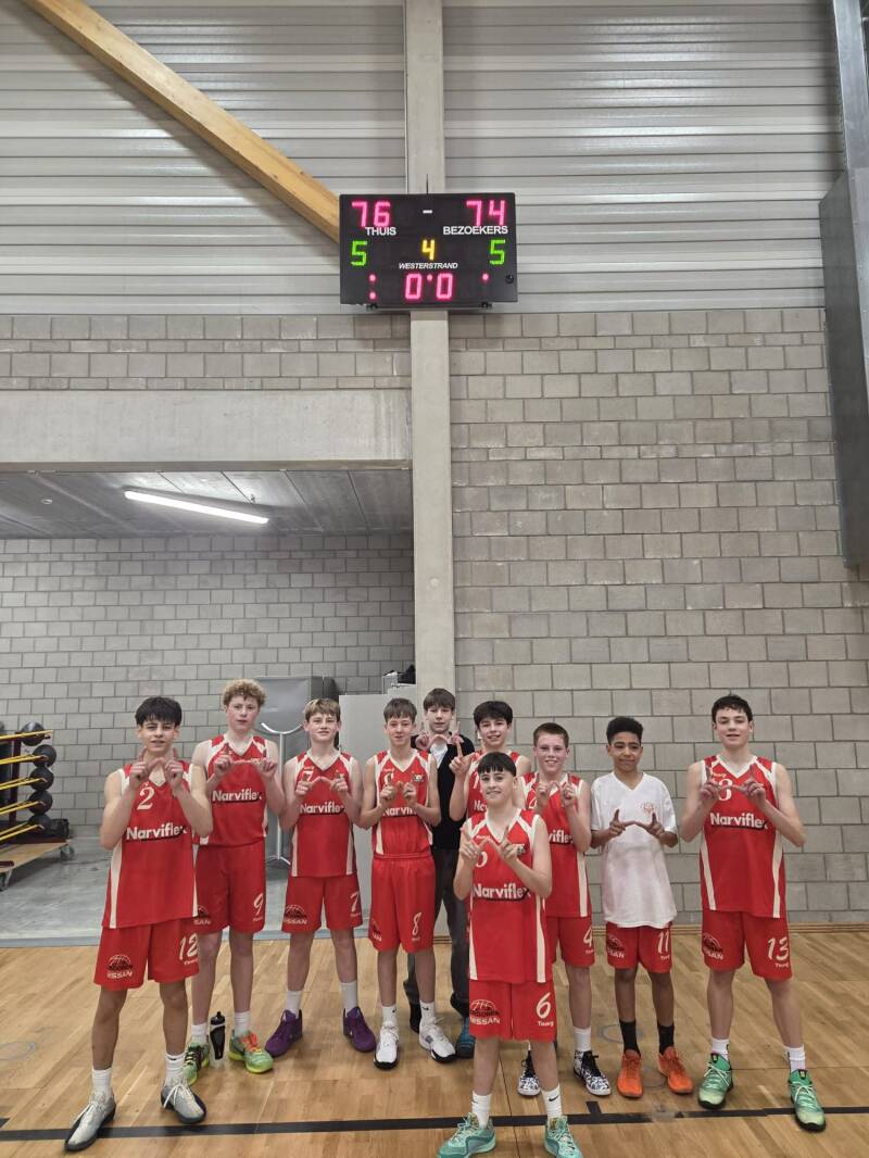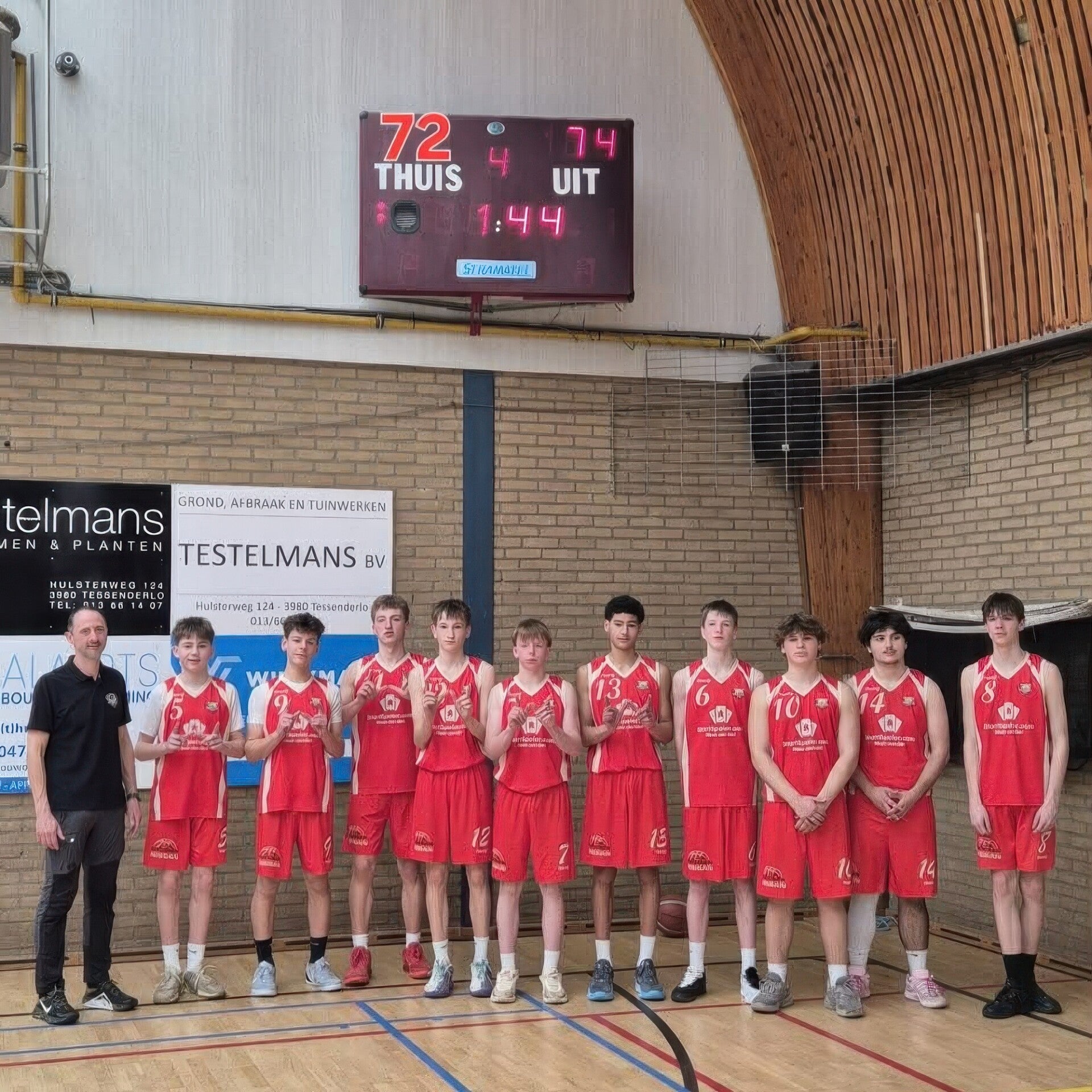 De U14A (grote foto) won zaterdagnamiddag thuis met heel klein verschil van Willebroek: 76-74. Daarmee zette de ploeg een eerdere misstap recht, want in de heenwedstrijd hadden ze nog met 30 punten verschil verloren. Die nederlaag was toen wel mede te wijten aan de afwezigheid van enkele sterkhouders door ziekte. Dit keer stond het team er wel en werd de rekening vereffend met een verdiende overwinning.