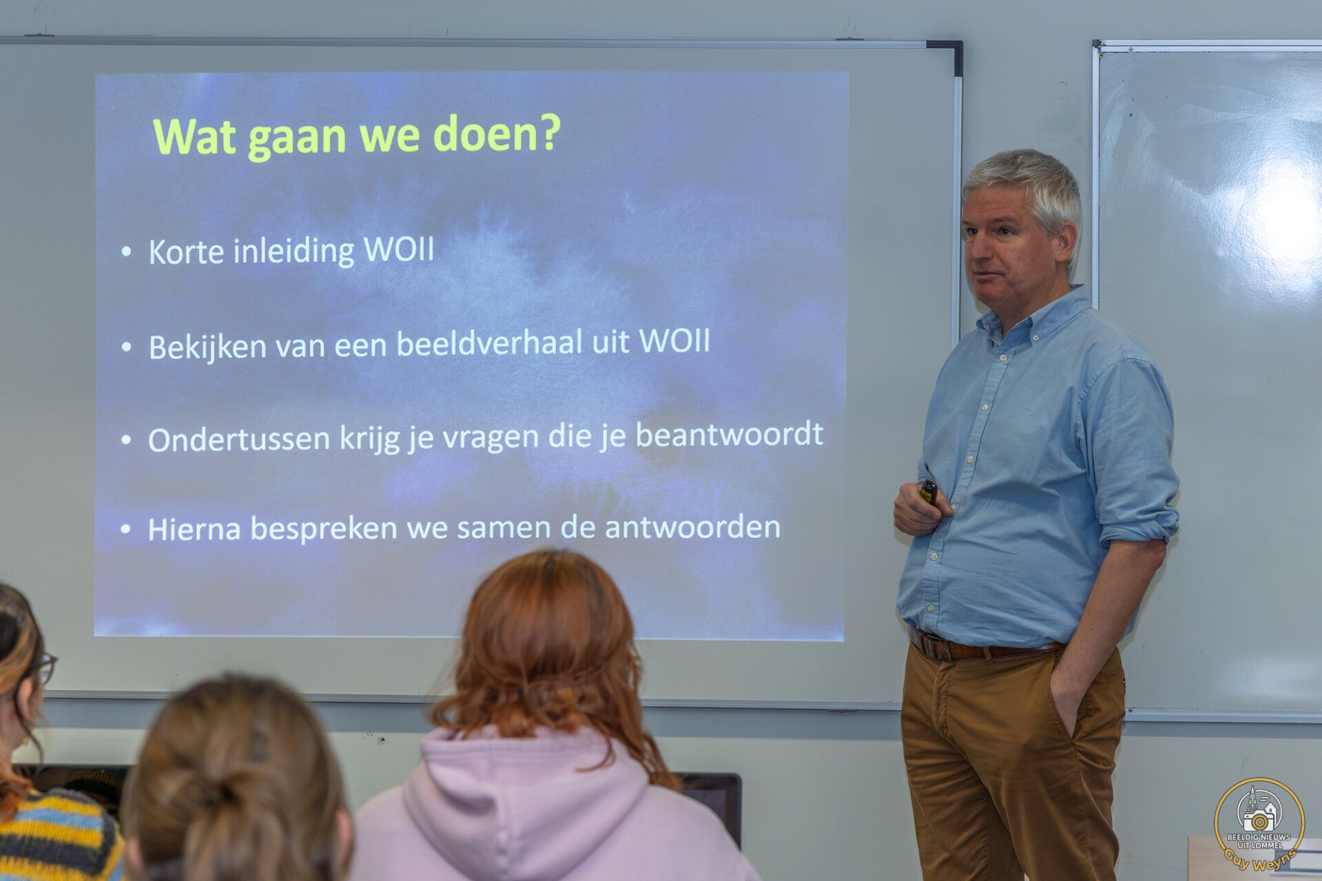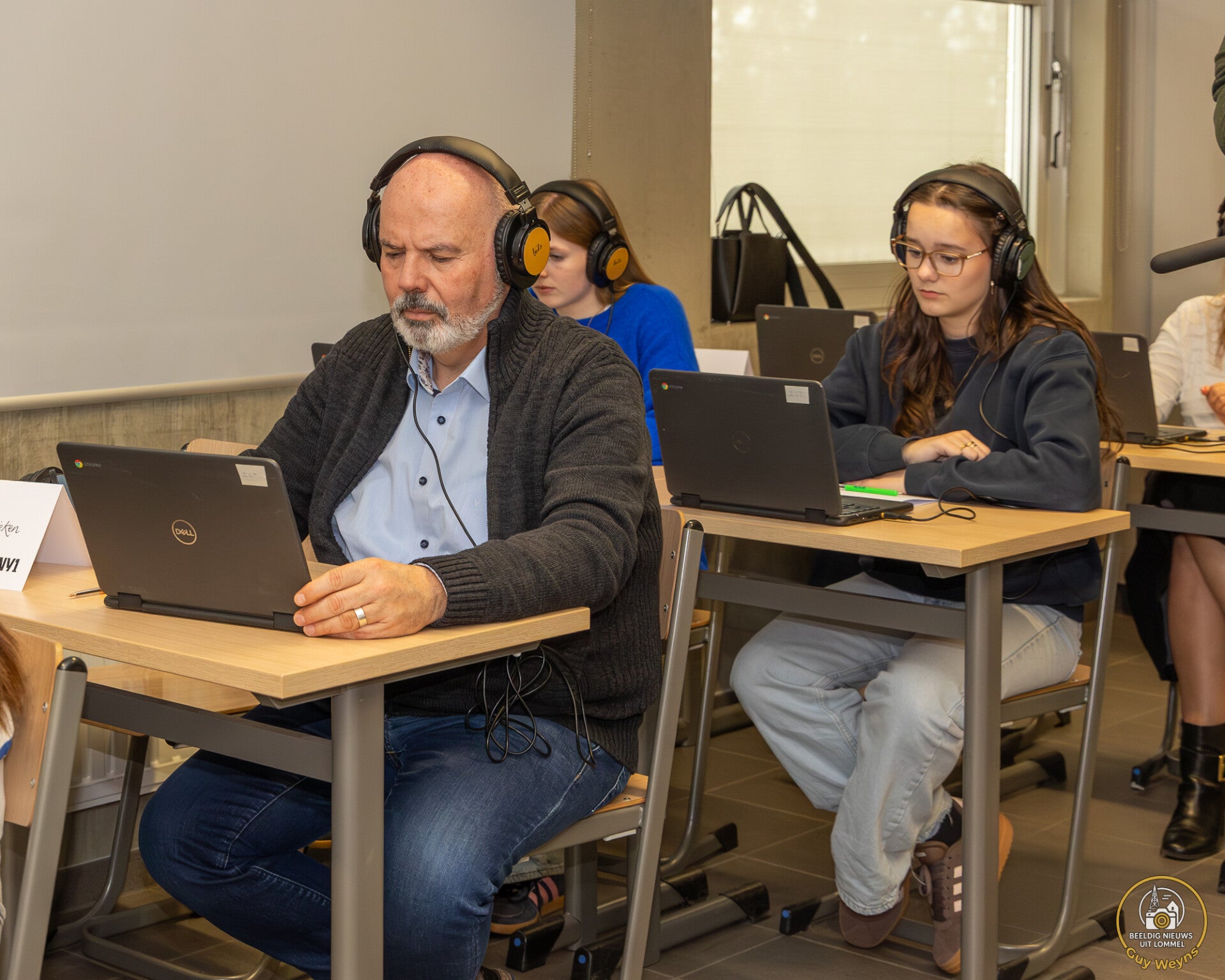 Na de inleidingen was het woord aan geschiedenisleraar Rik Blervacq (foto 4 onder), die de première in de klaspraktijk bracht. Hij nam de leerlingen eerst kort mee door de grote lijnen van de Tweede Wereldoorlog, om daarna het interactieve luik van Any1 op te starten. Met laptop en koptelefoon doken de leerlingen, en de schepenen en vertegenwoordigers, individueel in hun toegewezen verhaal, terwijl ze tegelijkertijd vragen moesten beantwoorden. Het unieke concept – dezelfde beelden, maar verschillende audioverhalen – zorgde meteen voor een andere manier van kijken en luisteren.
